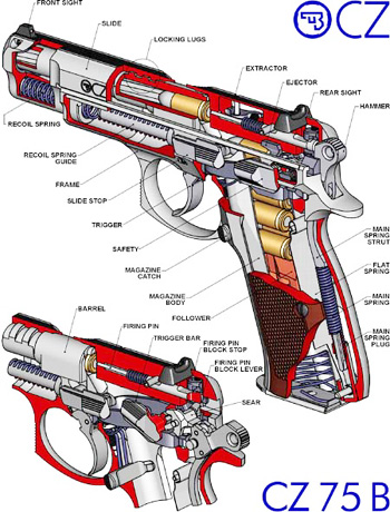 The slide slides backwards (that's why it's called a "slide", get it?) and absorbs some of the recoil when a shot is fired, ejecting the spent round, recocking the hammer and reloading a fresh one from the magazine as it goes. The barrel is generally covered by the slide and is simply the tube the bullet shoots along when fired. The firing pin is like a nail struck by the hammer at one end which hits the back of the round in the chamber at the other, igniting the primer which set off the round. Notice the magazine catch (or magazine release button) close to where the trigger guard meets the handle. The trigger is where you finger should NOT go until you are ready to fire. The safety, when engaged, blocks the pistol's mechanism so that it can't be fired. You need to disengage it in order to fire. The extractor grabs the end of the spent cartridge as the slide slides backwards and the ejector kicks the spent round out in an arc to the right of the pistol (so that is a bad place to stand if you're just watching - spent rounds are hot!).
